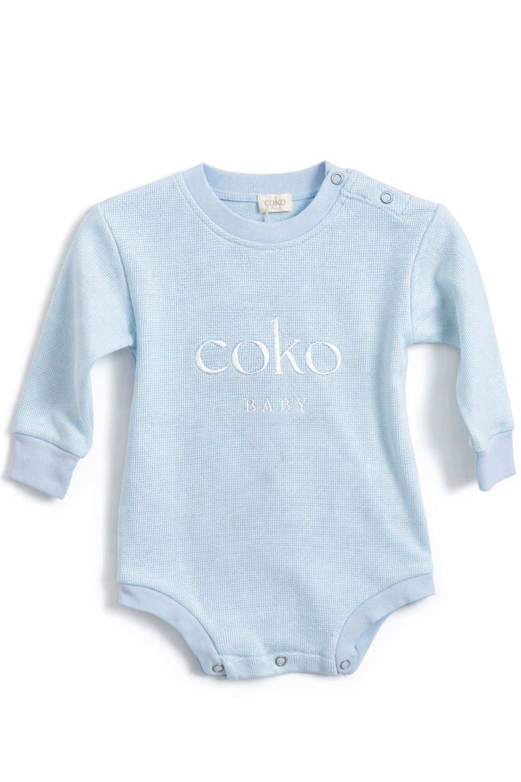 Introducing the adorable COKO Baby Waffle Embroidered Romper. Crafted from soft, breathable waffle cotton fabric, this romper is perfect for keeping your little one cozy in style. The sweet "COKO Baby" embroidery adds a charming touch, while the gentle texture of the waffle fabric offers comfort all day long. Featuring a pop of color, it’s both playful and versatile—ideal for wearing as a romper during warmer days or layering with tights for extra warmth in winter. A must-have for your baby’s wardrobe, combining softness, style, and practicality.