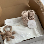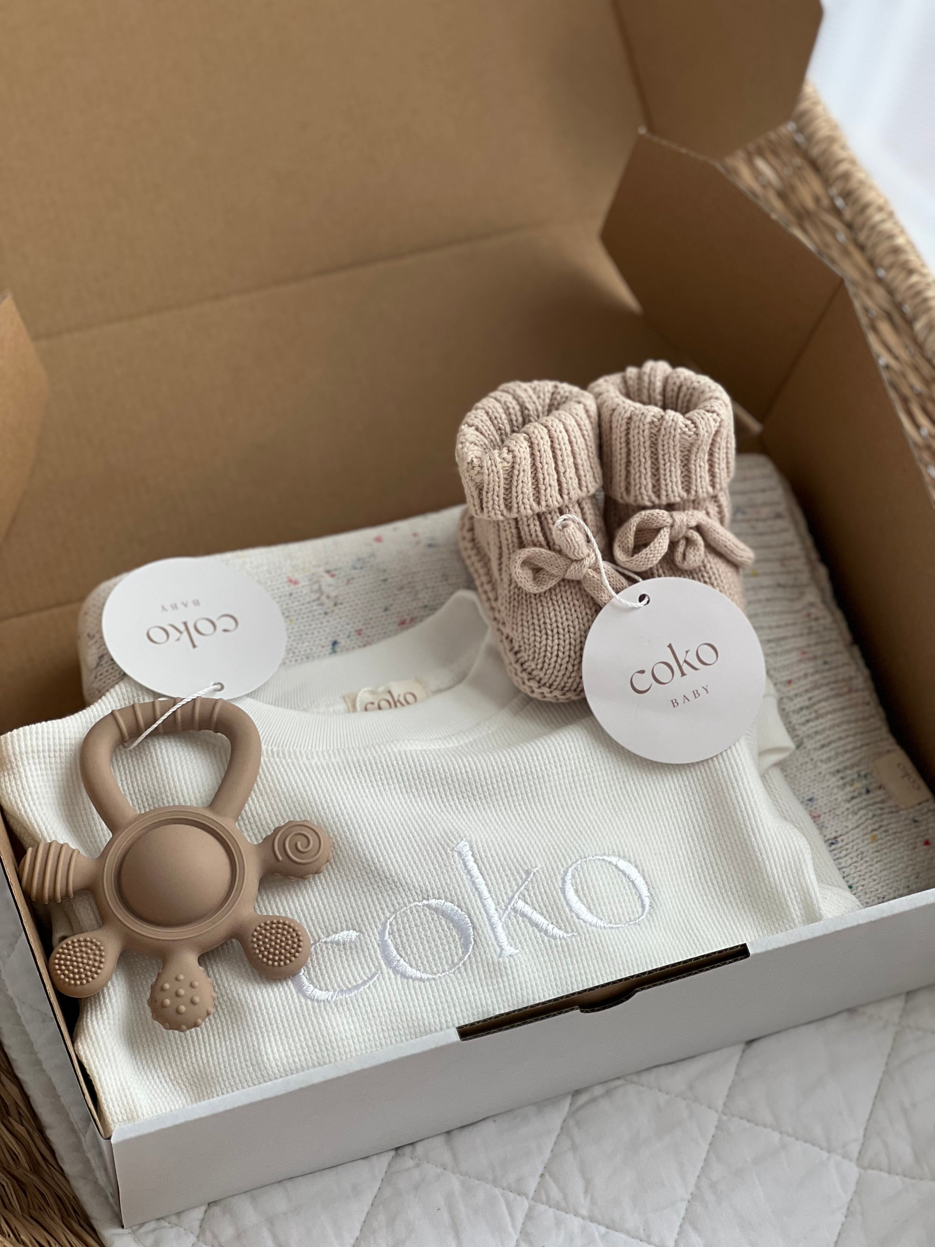Our New Baby Gift Hamper is a thoughtfully curated collection of timeless pieces to welcome a little one into the world. Featuring an Organic Cotton Milk Fleck blanket, Oat booties (0–4 months), silicon teether and our white COKO baby romper in 3-6m, this hamper is designed to be cherished long after those newborn days.