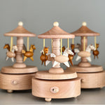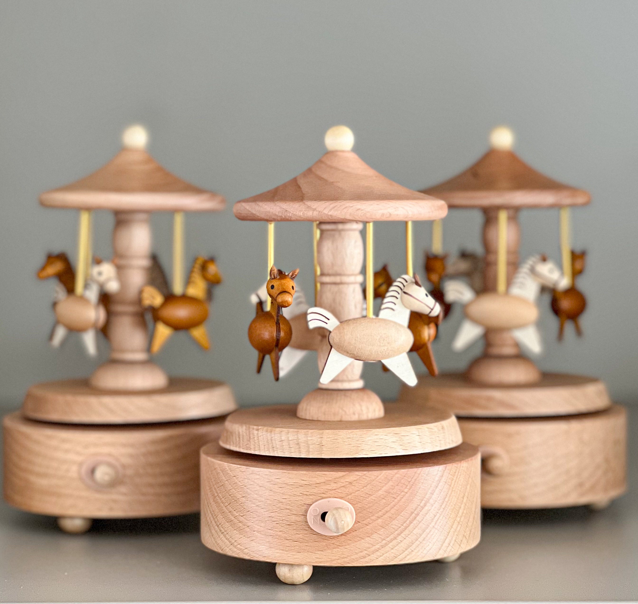 Watch them ride! This sweet little carousel is carved from smooth beechwood and features horses riding to a lovely tune. Just wind it up and let the magic begin, no batteries, no fuss, just pure charm. A perfect gift for tiny cowboys or new baby. A nursery keepsake for years to come.